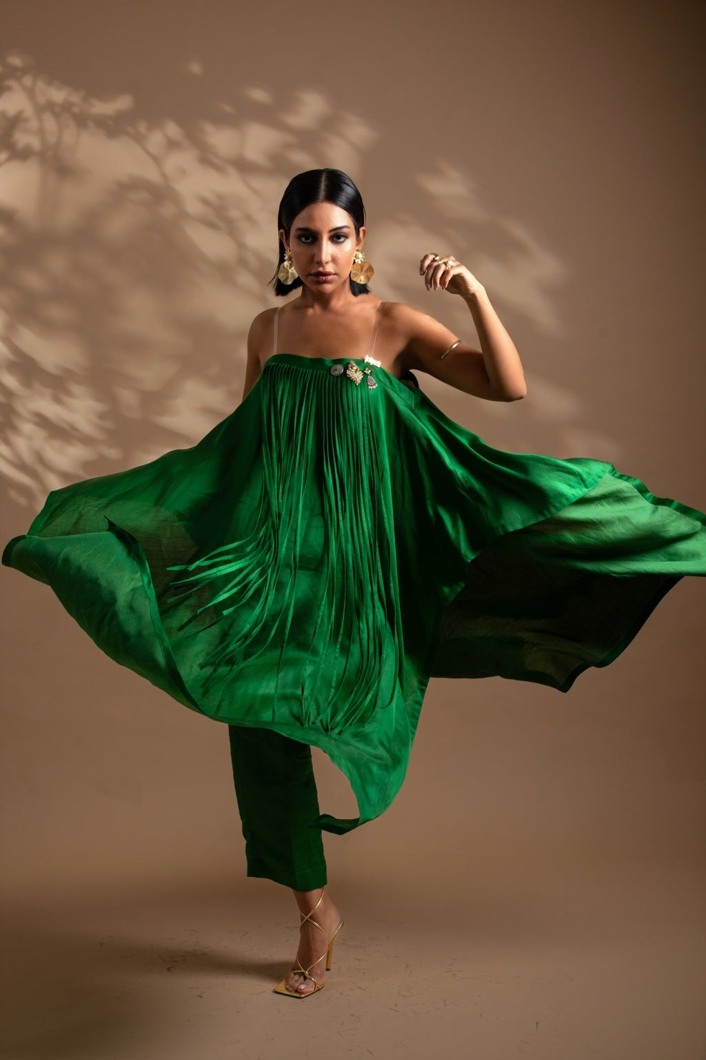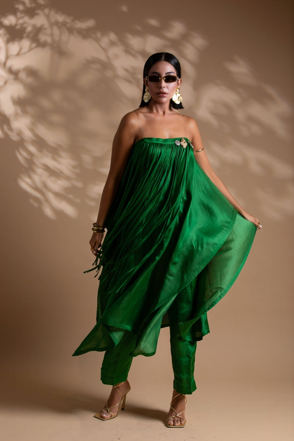 Fuljadi is joy in motion a flowing emerald ensemble inspired by the brilliance of a sparkler. Draped in layers of 50% linen and 50% satin, this strapless silhouette features delicate tassel accents, a detachable brooch, and slim tailored pants that balance flow with structure. A piece that embodies playfulness, festivity, and heirloom luxury.