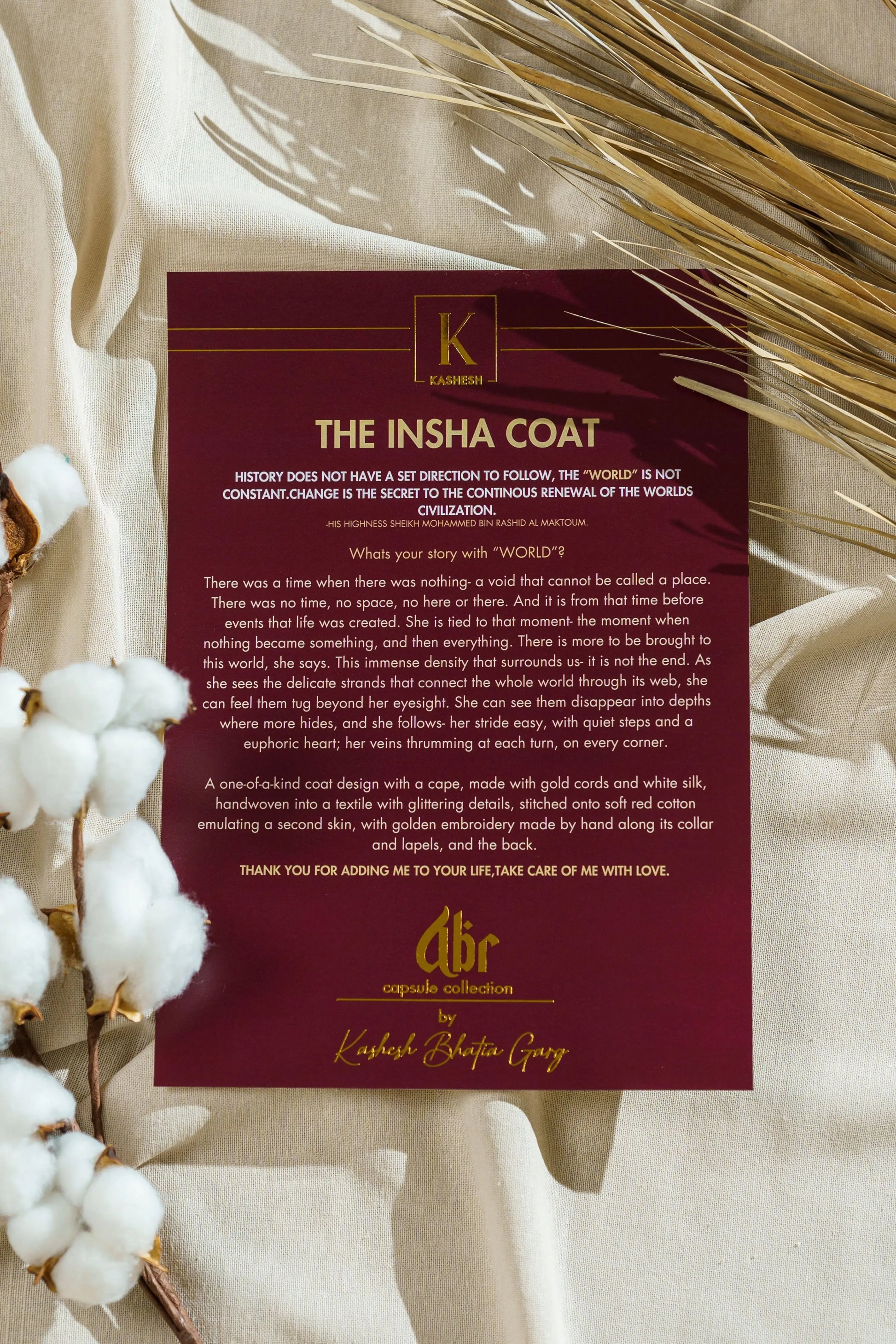 A one-of-a-kind coat design with a cape, made with gold cords and white silk, handwoven into a textile with glittering details, stitched onto soft red cotton emulating a second skin, with golden embroidery made by hand along its collar and lapels, and the back.
