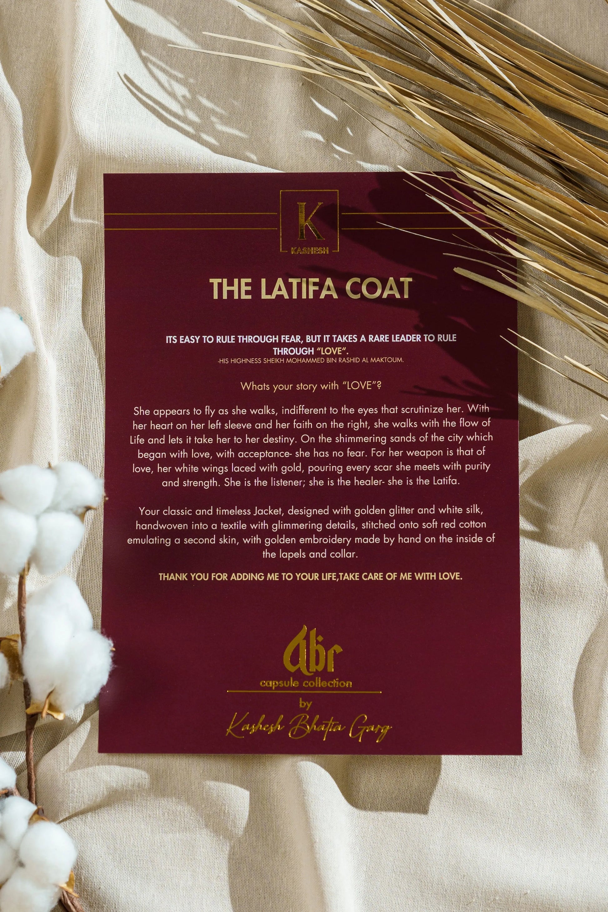 Your classic and timeless Jacket, designed with golden glitter and white silk, handwoven into a textile with glimmering details, stitched onto soft red cotton emulating a second skin, with golden embroidery made by hand on the inside of the lapels and collar.