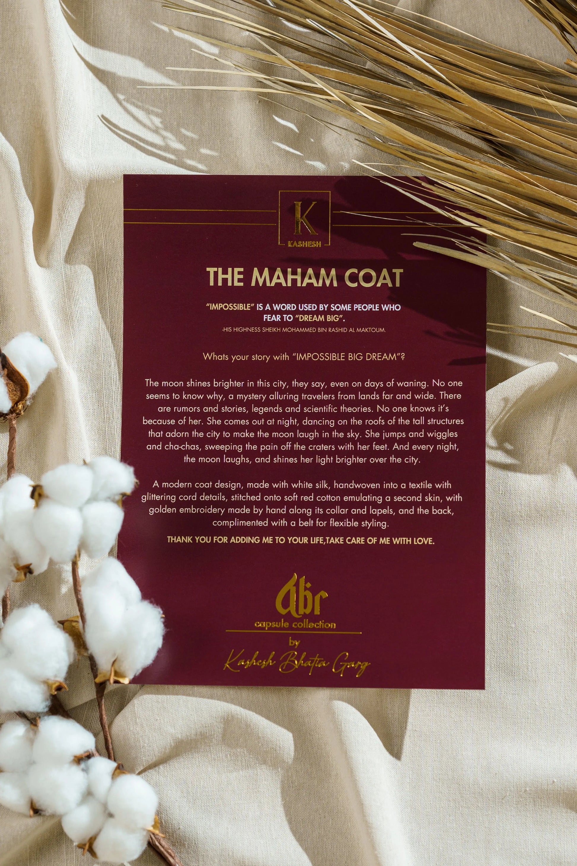 A modern coat design, made with white silk, handwoven into a textile with glittering cord details, stitched onto soft red cotton emulating a second skin, with golden embroidery made by hand along its collar and lapels, and the back, complimented with a belt for flexible styling.