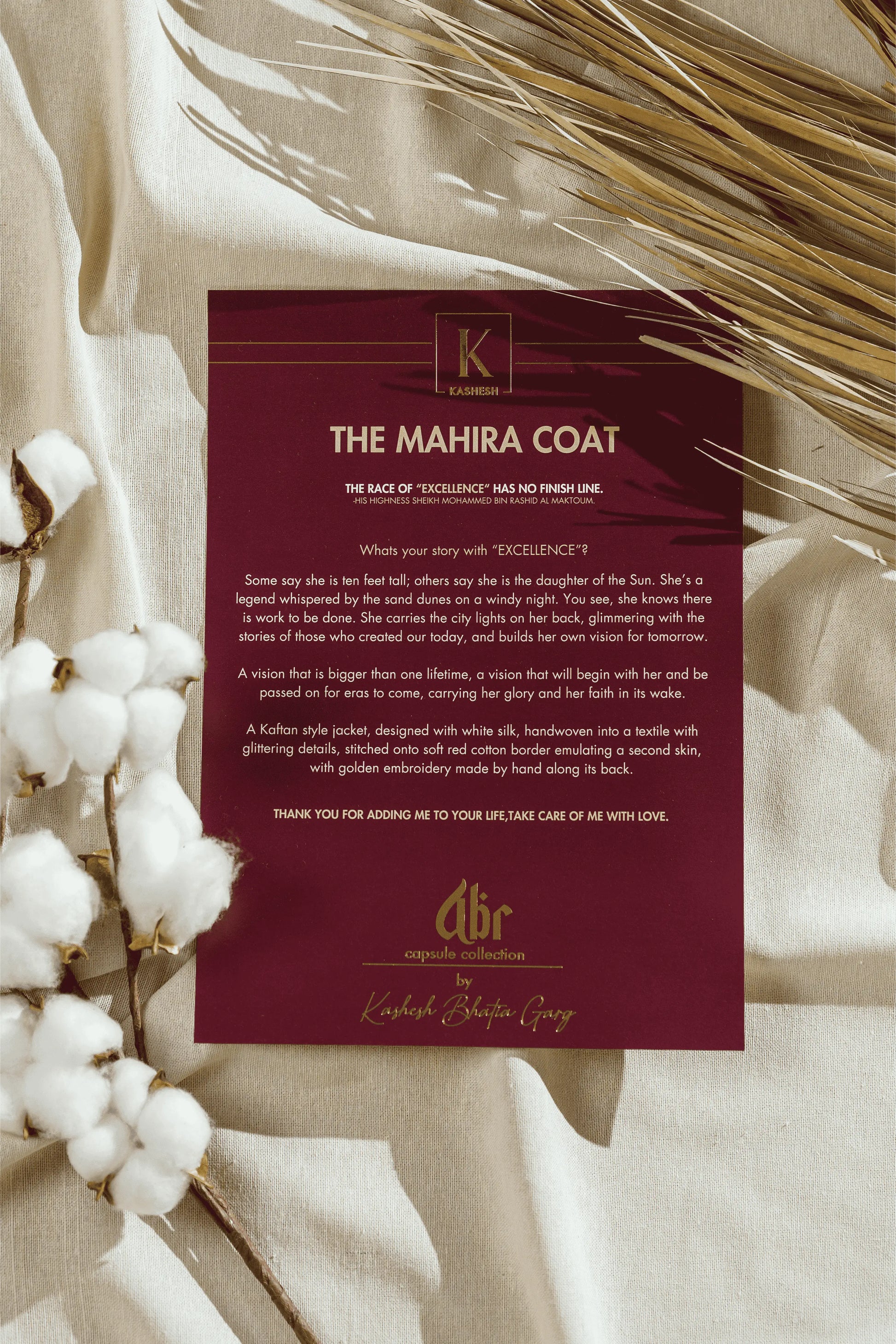 A Kaftan style jacket, designed with white silk, handwoven into a textile with glittering details, stitched onto soft red cotton emulating a second skin, with golden embroidery made by hand along its back and lapels.
