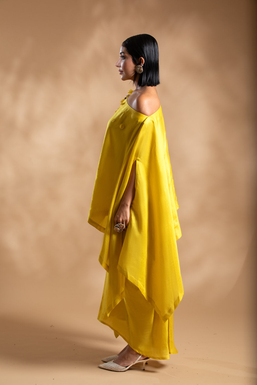 - Fit: Fluid cape overlay paired with draped skirt for effortless movement.