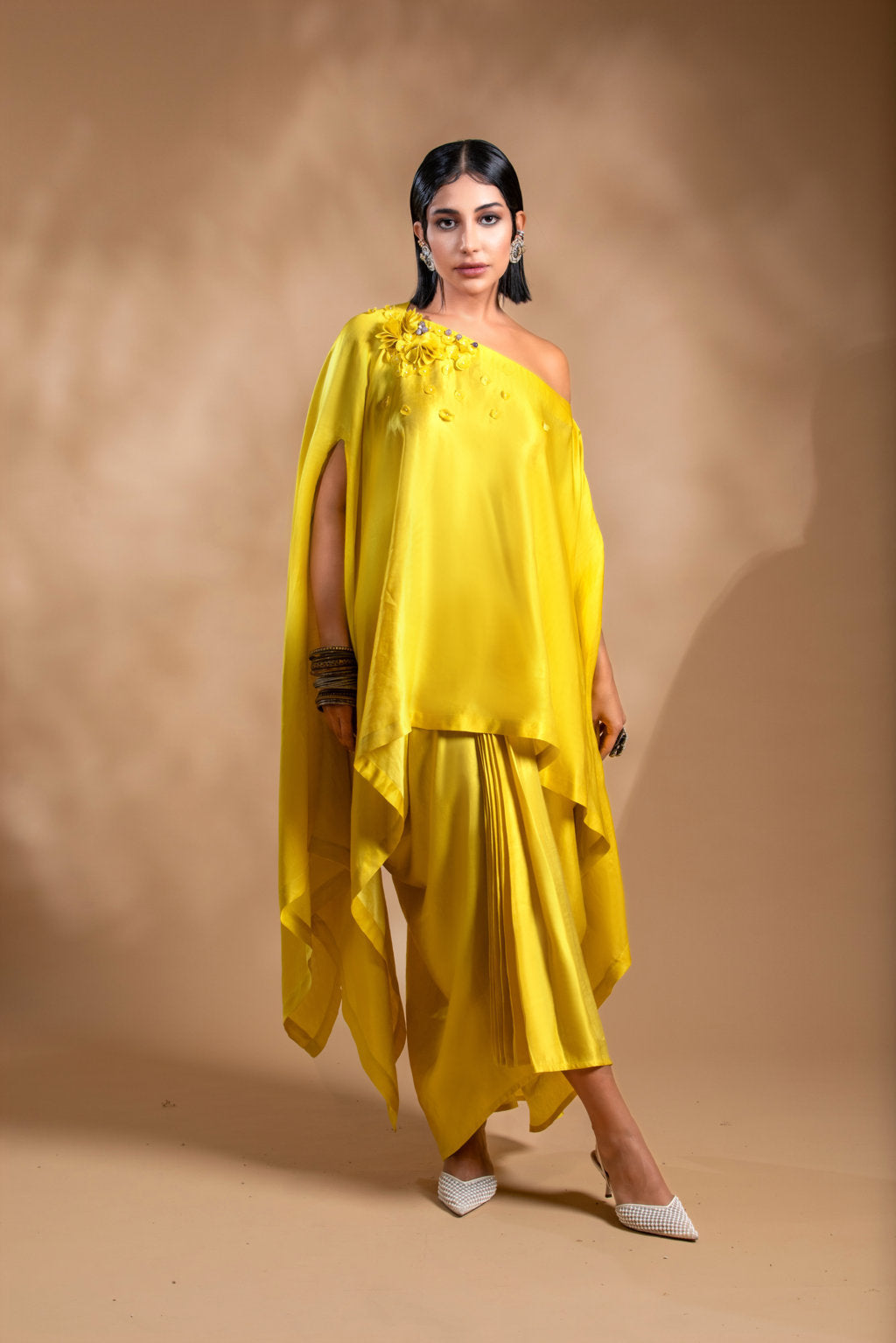 Noor is the light you can’t hold, yet it follows you everywhere. A luminous canary-yellow ensemble in 50% linen and 50% satin, designed with a flowing draped skirt and an off-shoulder cape blouse. The piece is elevated with floral and laser-cut embellished embroidery, hand-set with natural amethyst stones and pearls — making it as radiant in energy as it is in design. Noor embodies inner glow made visible — radiant, effortless, and timeless.