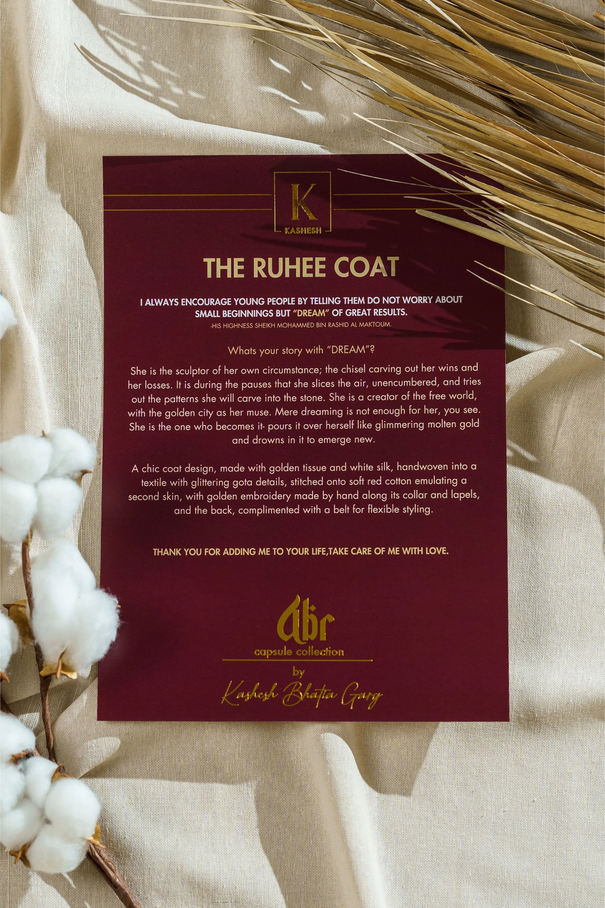 A chic coat design, made with golden tissue and white silk, handwoven into a textile with glittering gota details, stitched onto soft red cotton emulating a second skin, with golden embroidery made by hand along its collar and lapels, and the back, complimented with a belt for flexible styling.