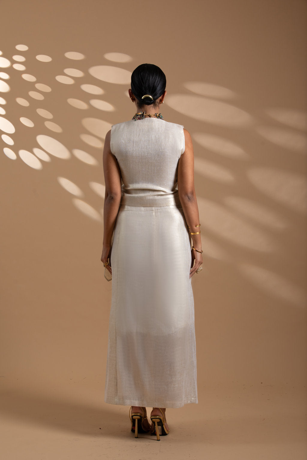 Sitara is elegance woven in starlight. Crafted in 100% linen lurex, this luminous ensemble features an overlap skirt and a versatile jacket with flowing overlay panels. The jacket is adorned with self laser-cut floral embroidery, delicately finished with small crystal beads — adding a subtle sparkle that feels like starlight itself. The structured jacket (21-inch length) contrasts beautifully with the fluid overlay (25–32 inches), allowing the piece to be styled from minimal chic to dramatic festive. With its soft metallic sheen and celestial vibe, Sitara is designed for the modern woman rooted in tradition, yet reaching for the stars.